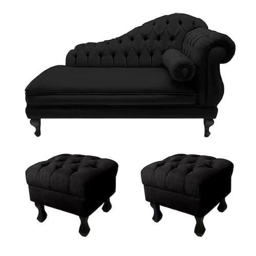 Divã Recamier Namoradeira Larissa 150cm + 2 Puffs Retrô Suede Preto - LM DECOR