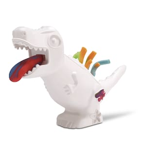 Coloque massinha na cabeça do dino, Aperte e...a língua dele aparece! Coloque massinha na parte de trás das costas, Aperte que os detalhes aparecem! e ainda vem com 03 potinhos de tinta e 01 pincel para você colorir o seu dino como quiser! Vem com um vulcão incrível que você coloca massinha e ela sai como lava e forminhas de várias espécies de dinos.