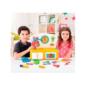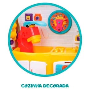 Toda colorida, cheia de detalhes como uma cozinha de verdade, a parede da cozinha imita tijolinhos com prateleiras e utensílios decorativos, além de um relógio super divertido onde o ponteiro gira para os lados! O fogão possui botão com barulhinho e moldes no plástico de escorredor de louça e boca de fogãozinho, o forninho é todo decorado com imagens de comidinhas gostosas, sua portinha abre e fecha e guarda uma panelinha. A torneirinha é um sucesso, seu corpo possui moldes variados para decorar suas massinhas, com 3 bicos para vários formatos de comidinha. Você também pode usar a caixa como cenário para brincar!