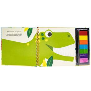 Este livro vem com sete almofadas de tinta em cores vibrantes que convida a criança a explorar o mundo dos dinossauros, utilizando suas próprias impressões digitais.