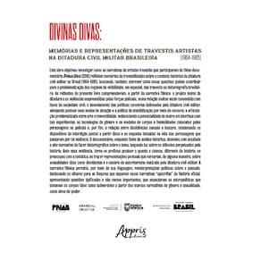 Esta obra objetivou investigar como as narrativas de artistas travestis que participaram do filme-documentário Divinas Divas (2016) refletem memórias de travestilidades sobre o contexto histórico da ditadura civil-militar no Brasil (1964-1985), buscando, também, entrever como essas questões podem contribuir para a problematização dos regimes de visibilidade, em especial, das travestis na historiografia brasileira. As reflexões do presente livro compreenderam, a partir da narrativa fílmica: o projeto moral da ditadura e as violências empreendidas pelas forças policiais, numa relação muitas vezes consentida com faces da sociedade civil; o desvelamento das políticas censórias delineadas pela ditadura civil-militar, almejando pontuar seus modos de atuação e a política de invisibilização por meio da censura; a articulação problematizada entre arte e travestilidade, evidenciando a potencialidade do teatro em interface com tais experiências; as tecnologias de gênero e os modelos de corpos e feminilidades colocados pelas personagens na película e, por fim, a relação entre dissidências sexuais e loucura, tensionando os dispositivos de interdição postos a partir disso e as sequelas deixadas na vida das personagens que passaram por tal violência. O documentário, enquanto fonte de análise histórica, desvelou com acuidade o viés normativo do fazer historiográfico sobre o tema, lançando luz sobre os silêncios perpetuados pela história. Ante essa evidência, torna-se profícuo pontuar o quanto o cinema, diferente da história, se preocupou com a temática, ao trazer representações pontuais que versaram, de alguma maneira, sobre sexualidades tidas como dissidentes e o cenário de autoritarismo matizado pela ditadura civil-militar. A narrativa fílmica permitiu, por meio de sua linguagem, reinterpretações políticas sobre o passado, deslocando os olhares para as fissuras que separam essas narrativas “apócrifas” da história oficial, apresentando questões tipificadas e não menos importantes, que anunciaram as micropolíticas que tomavam os corpos tidos como subversivos a partir dos marcos normativos de gênero e sexualidade, como alvos do poder.