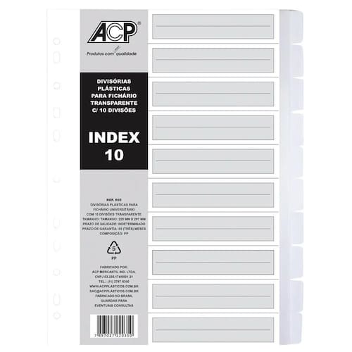 Divisória Plástica A4 Acp 10 Projeções Transparente As divisórias transparentes ACP com furação universitária são perfeitas para organizar seus documentos de forma eficiente. Com 10 divisões, você pode separar seus materiais por assunto, disciplina ou projeto. Compatíveis com diversos modelos de fichários e pastas, elas são essenciais para quem busca organização e praticidade. Pode ser em nossos fichários, fichários personnalité, pastas com grampo plástico, pastas com canaleta. Contém - 10 divisões - Marca: Acp - Modelo: Universitária - Referência: 655 - Transparente - Tamanho: A4 215 x 297mm - Composição: Polipropileno