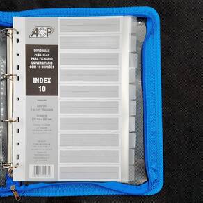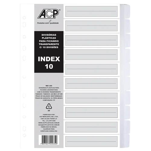 Divisória Plástica A4 Acp 10 Projeções Transparente As divisórias transparentes ACP com furação universitária são perfeitas para organizar seus documentos de forma eficiente. Com 10 divisões, você pode separar seus materiais por assunto, disciplina ou projeto. Compatíveis com diversos modelos de fichários e pastas, elas são essenciais para quem busca organização e praticidade. Pode ser em nossos fichários, fichários personnalité, pastas com grampo plástico, pastas com canaleta. Contém - 10 divisões - Marca: Acp - Modelo: Universitária - Referência: 655 - Transparente - Tamanho: A4 215 x 297mm - Composição: Polipropileno Marca: Não Informado