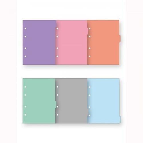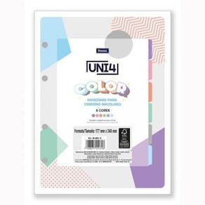 Divisórias no formato college, ideais para a organização e separação de matérias nos cadernos argolados. Possuem impressão nas cores: roxo, rosa, laranja, verde, cinza e azul.