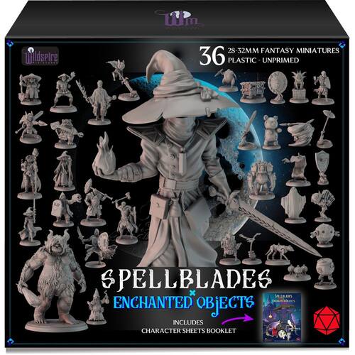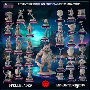 Wildspire Spellblades & Enchanted Objects for DND Miniatures Personagens de 28 mm, NPC e objetos animados para DND 28 mm Dungeons & Dragons Miniatures Bulk D&D Miniatures DND Minis DND Figures - O que vem na caixa? 36 miniaturas para DND, incluindo 15 Spellblades (heróis e/ou NPCs do tipo mago de batalha); 20 objetos encantados (por exemplo, espadas animadas, baú animado etc.) e uma rainha troll grande (“4 de altura”). Além de um livreto de fichas de personagens