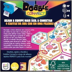 Divertido, rápido e frenético. Dobble Connect é o jogo de reflexos rápidos perfeito para todo mundo. Sejam a equipe mais ágil a conectar 4 cartas da sua cor em uma fileira!