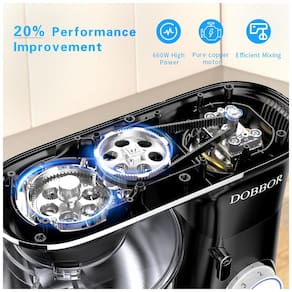 O misturador DOBBOR vem com uma tigela de 8,5 litros que oferece capacidade suficiente para uso familiar. Além disso, a tigela de mistura de aço inoxidável e a caixa de ABS são duráveis e fáceis de limpar. Misturadores de motor 660W e 6 1 velocidades. Este misturador elétrico de cozinha tem um motor potente de 660W, opções de 6 velocidades e função de pulso. Fazendo a ação de mistura completa e rapidamente e atender às diferentes necessidades de comida caseira, como bolo, pão, biscoito, pizza, salada, muffins e muito mais. Projeto da cabeça inclinada, antiderrapante e de proteção contra respingos O projeto da cabeça inclinada do misturador elétrico torna a instalação e remoção dos acessórios de mistura mais convenientes. As ventosas de silicone antiderrapantes evitam o movimento da batedeira durante a operação E a cobertura contra respingos evita que os ingredientes secos se espalhem e a massa respingue. Mantenha sua cozinha sempre limpa. Batedeira Elétrica para Cozinha com Acessório A batedeira inclui batedeira de aço inoxidável, batedeira de alumínio, batedeira e proteção contra respingos que são fixados no eixo, aumentando a versatilidade da batedeira