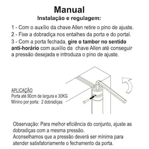 Dobradiça com Mola para fechamento automático suave das portas. Utilizada no lugar das molas aéreas funciona perfeitamente em portas pesadas e leves. Com uma mola interna de fácil regulagem da força de fechamento é super fácil de instalar, discreta mantendo a estética da porta e economiza espaço que uma mola aérea convencional ocupa. Características Medidas: 3.1/2 x 3 79 x 89mm Espessura: 2mm Material: Aço Acompanha Chave Allen para regulagem: Sim Capacidade de peso: 20 kg por dobradiça Dica Em portas de 2,10 de altura, mesmo pesando menor do que 60 kg o ideal é ser colocado 3 dobradiças para um bom funcionamento da mola Instruções para Instalação e regulagem 1 Encaixe a chave Allen na cavidade sextavada 2 Retire o Pino de Ajuste girando e pressionando a chave contra a dobradiça 3 Fixe a dobradiça de maneira convencional, depois de retirar o pino de ajuste 4 Com a porta fechada, encaixe novamente a chave allen na cavidade sextavada 5 Gire-a em sentido anti-horário, pressionando-a contra a dobradiça 6 Recoloque o pino de ajuste no orifício mais à esquerda 7 Cada orifício corresponde a uma pressão para fechar a porta. Quanto mais girar a chave a direita e colocar o pino a esquerda, maior será a pressão. ajuste da maneira necessária a sua necessidade ----------------------------------------------------------------------------------------------------------------------- Marca: Não Informado