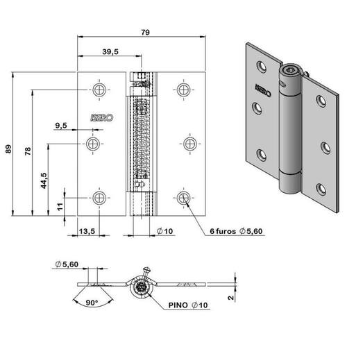 Dobradiça com Mola para fechamento automático suave das portas. Utilizada no lugar das molas aéreas funciona perfeitamente em portas pesadas e leves. Com uma mola interna de fácil regulagem da força de fechamento é super fácil de instalar, discreta mantendo a estética da porta e economiza espaço que uma mola aérea convencional ocupa. Características Medidas: 3.1/2 x 3 79 x 89mm Espessura: 2mm Material: Aço Acompanha Chave Allen para regulagem: Sim Capacidade de peso: 20 kg por dobradiça Dica Em portas de 2,10 de altura, mesmo pesando menor do que 60 kg o ideal é ser colocado 3 dobradiças para um bom funcionamento da mola Instruções para Instalação e regulagem 1 Encaixe a chave Allen na cavidade sextavada 2 Retire o Pino de Ajuste girando e pressionando a chave contra a dobradiça 3 Fixe a dobradiça de maneira convencional, depois de retirar o pino de ajuste 4 Com a porta fechada, encaixe novamente a chave allen na cavidade sextavada 5 Gire-a em sentido anti-horário, pressionando-a contra a dobradiça 6 Recoloque o pino de ajuste no orifício mais à esquerda 7 Cada orifício corresponde a uma pressão para fechar a porta. Quanto mais girar a chave a direita e colocar o pino a esquerda, maior será a pressão. ajuste da maneira necessária a sua necessidade Marca: Não Informado