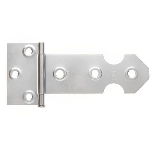 Descrição: A dobradiça de leme recebe esta terminologia em decorrência da forma da aba que realiza a fixação da folha do portão, que se assemelha ao formato de um leme de barco. A dobradiça de leme é produzida em aço, como acabamentos superficiais por várias técnicas, como o banho galvânico de Zinco Azul e o Zinco Amarelo Bicromatizado, que têm como função prolongar sua vida útil, o que aumenta o custo-benefício na aquisição do produto. A dobradiça de leme é utilizada em portões construídos em madeira, sendo que tanto a sua fixação no batente, quanto a fixação da folha ao portão são realizadas pela aplicação de parafusos. Este modelo se destaca entre outros disponíveis no mercado por ser desenvolvido para a sustentação de portões mais leves.