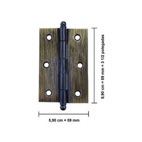 Dobradiça para porta antique ouro velho 3 1/2 tolemat - 3 peças + parafusos Jogo de dobradiças 3 1/2 polegadas com pino bola. Cada unidade corresponde a uma cartela com 3 dobradiças + parafusos para fixação. Medidas da dobradiça aberta: 89 mm altura x 59 mm largura x 1.5 mm espessura. Pode ser em portas ou janelas, podendo ser de madeira ou metálicas. Marca: tolemat Acabamento: antique Marca: Não Informado