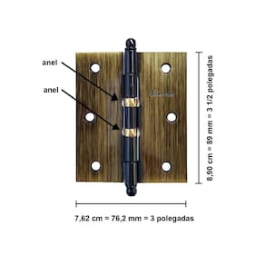 Dobradiça para porta antique ouro velho 3 1/2 x 3 com anel tolemat 3 peças + parafusos Jogo de dobradiças 3 1/2 x 3 polegadas com anéis e pino bola. Cada unidade corresponde a uma cartela com 3 dobradiças com anéis + parafusos para fixação. Medidas da dobradiça aberta: 89 mm altura x 76,2 mm largura x 1,7 mm espessura. Pode ser em portas ou janelas, podendo ser de madeira ou metálicas. Marca: tolemat Acabamento: antique Marca: Não Informado