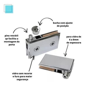 É importante destacar que essa dobradiça não é de pressão, possuindo um pino de baixo embutido para maior estabilidade e segurança. Para a instalação, é necessário recortar e furar o vidro sob medida. Recomendamos ter as dobradiças em mãos ao solicitar a confecção dos vidros.