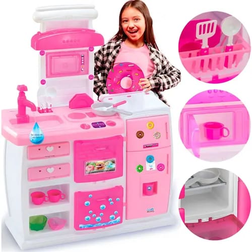 A Doce Cozinha Magic da Magic Toys é a escolha perfeita para estimular a imaginação e criatividade das crianças! Com 93 cm de altura, esta cozinha de brinquedo completa oferece diversas funcionalidades realistas que tornam a brincadeira ainda mais divertida.A pia vem com uma torneira que solta água de verdade, uma lava-louças com escorredor, micro-ondas com porta que abre e fecha, geladeira com prateleira para organizar os brinquedos, um forninho com grelha, e gavetas com porta-talheres.A cozinha também conta com 19 acessórios, incluindo panelas, talheres, xícaras, pires e forminhas, para tornar a brincadeira ainda mais interativaPerfeita para crianças que adoram imitar as atividades da vida real, a Doce Cozinha Magic incentiva a interação social, o desenvolvimento de habilidades motoras e a diversão saudável. Um presente encantador para momentos inesquecíveis de faz de conta!ESPECIFICAÇÕES:- Recomendado a partir de 3 anos- Dimensões aproximadas da embalagem (CLA): 67 x 32 x 69 cm- Altura aproximada da cozinha: 93 cm- Contém: 01 Doce Cozinha Magic, 02 Pires, 02 Xícaras, 02 Colheres, 02 Garfos, 02 Facas, 01 Escumadeira, 01 Facão, 01 Concha, 02 Escorredores, 02 Forminhas, 01 Panela, 01 Copo- Pia com torneira que sai água de verdade- Micro-ondas, geladeira, forninho e gavetas com portas abre e fecha- Muitos acessórios!- Material: Plástico Polipropileno- Marca: Magic Toys- Referência: 7902- Número de registro/certificação INMETRO: 090/2023ATENÇÃO: As cores e detalhes podem variar de acordo com o lote de fabricação em relação às imagens apresentadas.