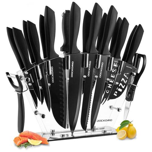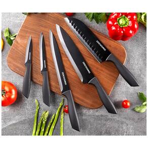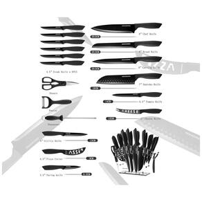 Matéria prima de qualidade e lâminas afiadas feitas de aço inoxidável de alto carbono 3CR14 é forjado a partir de uma peça sólida de aço Processa o aço de uma maneira específica para garantir que tenha uma alta dureza de 52 Rockwell. Isso faz com que cada faca tenha extrema nitidez, resistência à ferrugem, gume de longa duração e excelente tenacidade. As pontas das facas são cuidadosamente afiadas à mão, mantendo o equilíbrio entre a obtenção de fatias ultrafinas e a máxima resiliência que ajuda a picar os alimentos. Lâminas com revestimento de cerâmica dura e cabo ergonômico O revestimento de cerâmica dura aumenta a capacidade antiaderente, permitindo que os alimentos sejam lavados com facilidade. Ele também evita embotamento e ferrugem de forma eficaz. O cabo ergonômico oferece uma pegada forte para realizar trabalhos delicados e ajuda a reduzir o cansaço das mãos. Aparência e design engenhosos O conjunto de facas de cozinha tem uma aparência única em comparação com outros conjuntos de facas comuns. As lâminas revestidas de cerâmica dura preta legal e o design das alças de estilo preto legal, parecem mais delicadas e elegantes. Pode fazer com que cozinhar simples se torne uma criação de beleza Marca: Não Informado