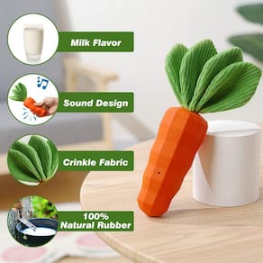 - Folhas verdes feitas de pelúcia não recheada com papel enrugado no interior. Corpo de cenoura laranja feito de borracha l. As dimensões do brinquedo são 9 pol* 1,8 pol. É adequado para cães médios com cerca de 30 a 60 libras, não para cães extras. ?Embora os brinquedos para cães sejam resistentes, não há brinquedos indestrutíveis, a supervisão adequada também é recomendada.?