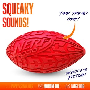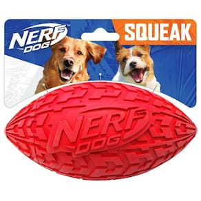 - NERF-TOUGH: materiais de qualidade NERF tornam nosso brinquedo Tire Squeak Football perfeito para buscar e ensinar novos truques ao seu cão
