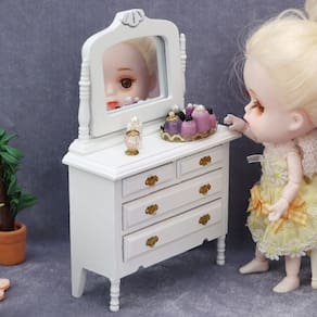 Tamanho: 9,7 x 4 x 15 cm (comprimento, largura e altura) Material: madeira compensada Peso: 150 g Não é adequado para crianças menores de 3 anos; contém peças pequenas. Possui um elegante espelho oval com design vintage, adicionando charme a qualquer quarto ou sala de estar de casa de bonecas em miniatura. Feito de madeira compensada de alta qualidade, projetado para complementar casas de bonecas em escala 1:12 para uma aparência autêntica. Perfeito para adicionar um toque realista à decoração da sua casa de bonecas, com gavetas detalhadas para armazenamento em miniatura. Uma adição maravilhosa a qualquer configuração de casa de bonecas, projetada para exibir e fingir, aprimorando as atividades criativas.