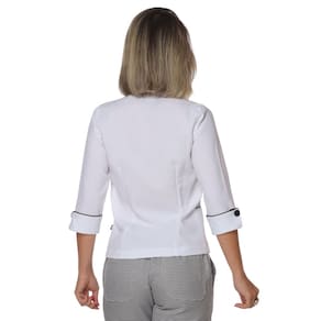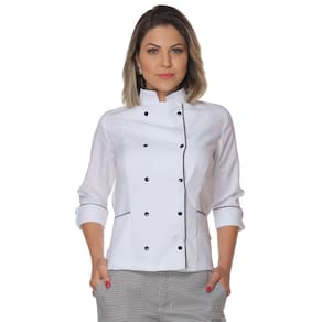 A Dolmã Chef de Cozinha feminina ACINTURADA manga 3/4 é produzido em tecido Oxford Premium. Fechamento frontal com botões de pressão para a rápida remoção da vestimenta em caso de imprevistos. Essa peça foi desenvolvida, pensando naqueles profissionais que atuam nas cozinhas com temperatura elevada. Ideal para Chefes de Cozinha, que trabalham em eventos Gourmet e querem se destacar no seu espaço. Possui dois bolsos laterais. A Dolmã possui gola tipo Padre, que deixa você com mais estilo. Costurado com máquinas eletrônicas. Acabamento com viés preto, o que torna a peça mais resistente e da um toque de elegância para o usuário. Tecido leve, confortável, fácil de lavar e seca rapidamente. Baixo grau de amarrotamento. Destaca-se como a melhor proposta em relação ao custo-benefício, e sua composição 100% poliéster proporciona bem-estar e boa apresentação. É fabricado em tecido 100% poliéster. Veja seu tamanho ideal na tabela de medidas. Referência: 413GA12