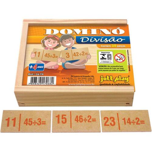 - DOMINÓ DE DIVISÃODescrição do Produto:Uso: Formação de sequências, relacionando a operação com o seu resultado.Desperta a atenção do aluno para a necessidade de operacionalizar mentalmente inclusive com duplas possibilidades, pois podem-se colocar as peças em qualquer das extremidades.Desenvolve: Raciocínio matemático, atenção, cálculo mental, fixação do conteúdo, integração em grupo.Composição de cada jogo : 28 peças de madeira, com impressão de operações e seus resultados.Acondicionados em caixa de madeira medindo 05x9x27cm.INMETRO CE-BRI/003N 3107-07 NM300/2002