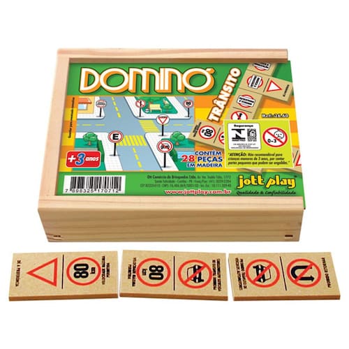 Dominó De Trânsito 28 Peças Jottplay Brinquedos que ensinam, educam e divertem Dominó de trânsito Uso:o jogo de dominó, basicamente, relaciona-se a capacidade de associação de idéias, desenvolvendo o raciocínio e a antecipação. Este jogo de dominó caracteriza-se ainda por associar signos pertencentes a vida cotidiana, permitindo o aprendizado e familiarização das crianças com as frutas. Desenvolve: associação de idéias, raciocínio, antecipação, fixação de conteúdo específicos. Composição: 28 peças de madeira artisticamente serigrafado com desenhos de diversos motivos. Acondicionados em caixa de madeira medindo 16x13x3,5cm. Tamanho das peças 3,5 x 07 x 0,5 cm INMETRO CE-BRI/003N 3107-07 NM300/2002 Ean: 7898325170712
