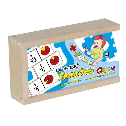 Dominó Frações - Madeira - 1029 - Carlu O dominó facilita a aprendizagem do raciocínio lógico, concentração e memoria, além de ser uma ótima ferramenta pedagógica quando aliado a diferentes temas e disciplinas. Descritivo detalhado:Confeccionado em M.D.F. 28 peças de 7 x 3,5 cm, pintada e serigrafada com tinta ultravioleta atóxica em uma das faces. Embalagem: Caixa de madeira com tampa serigrafada medindo 17 x 9,5 x 4 cm. Lacrada com película de P.V.C. Encolhível. Idade: A partir de 3 anos. Material: M.D.F. Embalagem: Caixa de madeira com tampa serigrafada. Lacrada com película de P.V.C. Encolhível. Ref.: 1029. Conteúdo da embalagem: 28 peças. Medidas do produto C x A x L 17 x 10 x 4 cm. Medidas da embalagem: C x A x L 17 x 10 x 4 cm. Peso aproximado do produto: 350 gramas. Embalagem: caixa de papelão. Prazo de garantia: 03 meses de garantia legal. Observe atentamente a idade recomendada para o brinquedo. Pode conter partes pequenas que podem ser engolidas e perigosas. Fotos ilustrativas as cores e modelos podem sofrer alterações sem aviso prévio. A indústria Carlu Brinquedos nasceu de um sonho. Sonho de uma professora, dinâmica, disposta e com a ideia fixa de vencer e vender algo que ela mesma pudesse criar e produzir. INMETRO CE-BRI/ICEPEX-N 00934-29 NBR NM 300/2004