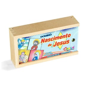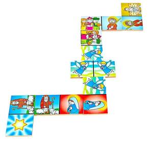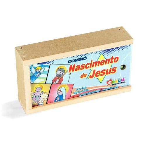 O dominó desenvolve a memória, o raciocínio e a percepção visual, além de auxiliar no ensino religioso das crianças. Confeccionado em M.D.F. Composto por 28 peças de 7 x 3,5 cm, pintadas e serigrafadas em policromia ultravioleta atóxica em uma das faces com ilustrações do Nascimento de Jesus .