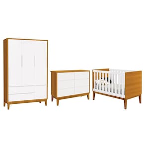 Dormitório Completo Infantil Classic 3 Portas, Cômoda 6 Gavetas e Berço com Pés Amadeirado - Reller Móveis O Dormitório Completo Infantil Classic é baseado no estilo clean, traz consigo conceitos de elegância e charme. Conta com um belíssimo Guarda-Roupa com excelentes repartições internas para roupinhas ficarem sempre organizadas. A Cômoda 6 gavetas é um ótimo auxilio para o guarda-roupa, oferece espaço para roupas dobráveis e pequenos acessórios. E para completar o Berço se transforma em uma charmosa mini cama, acompanhando o desenvolvimento do seu filho e auxiliando na transição do berço para caminha. O quartinho do bebê vai ficar muito mais aconchegante com esse conjunto.