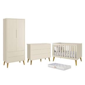 Dormitório Completo Infantil Theo 2 Portas, Cômoda 6 Gavetas, Berço com Pés Amadeirado e Colchão D18 - Reller Móveis - Bege Claro