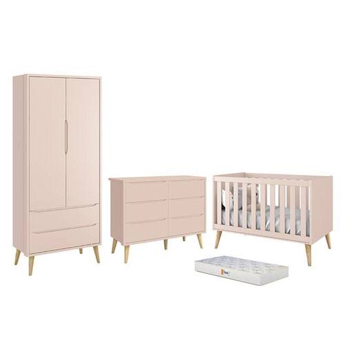 Dormitório Completo Infantil Theo 2 Portas, Cômoda 6 Gavetas, Berço com Pés Madeira Natural e Colchão D18 - Reller Móveis - Rosa