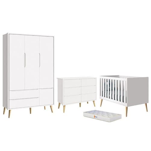 Dormitório Completo Infantil Theo 3 Portas, Cômoda 6 Gavetas, Berço com Pés Madeira Natural e Colchão D18 - Reller Móveis