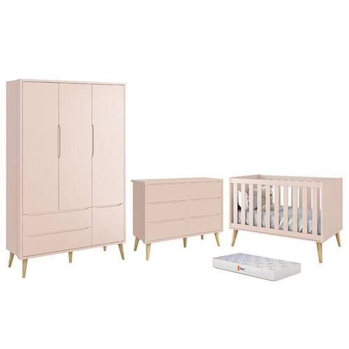 Dormitório Completo Infantil Theo 3 Portas, Cômoda 6 Gavetas, Berço com Pés Madeira Natural e Colchão D18 - Reller Móveis