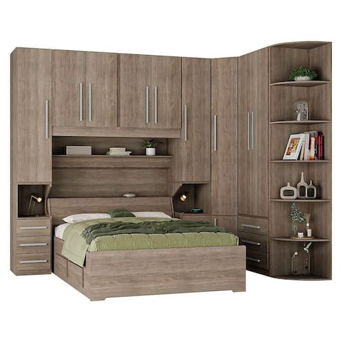 Dormitório De Casal Sem Cama 1219s Castanho * Cama, colchão e itens de decoração não estão inclusos. Imagens meramente ilustrativas. Ideal para casais que procuram de um dormitório robusto, com bom espaço interno, com bom aproveitamento do cômodo, cada dia mais compacto nos ambientes das grandes metrópoles. 02 Guarda-roupas de 1 porta e 3 gavetas com mesa de cabeceira embutida modelo 1416; 01 Maleiro de casal 4 portas modelo 1226; 01 Armário de Canto Sextavado modelo 1231; 01 Guarda-roupa de 2 portas e 3 gavetas modelo 1228; 01 Cantoneira com 6 prateleiras curvas modelo 1322; - Corrediças, dobradiças a cabideiros de metal; - Chapa de 15mm de espessura; - Puxadores 256mm; DIMENSÕES DO PRODUTO MONTADO - ALTURA 240 CM; - LARGURA 298,4 CM; - PROFUNDIDADE 51CM NOS ARMÁRIOS E 190CM MÍNIMO PARA COLOCAÇÃO DA CAMA Vão livre de 146cm de comprimento por 110cm de altura abaixo do maleiro. Para compras de dormitórios sem a cama inclusa lembre-se sempre de verificar se a cabeceira da sua cama cabe neste espaço. Embora a cama não acompanhe, informamos que o painel, o frontal e prateleira localziados abaixo do maleiro são inclusos (pois fazem parte do maleiro e não da cama). Produto entregue desmontado. Requer montagem. Manual disponível no site do fabricante. Atenção: Não nos responsabilizamos, no ato da entrega, por desmontagens, subir escadas/elevadores ou transporte por guincho para apartamentos. Eventuais despesas são de responsabilidade do cliente. Confira as dimensões deste produto e certifique-se de que o mesmo passará normalmente por supostos elevadores, portas, escadas e/ou corredores de sua moradia.