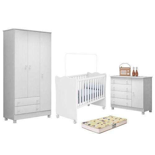 Dormitório Doce Sonho 3 Portas, Cômoda 1 Porta, Berço Branco Com Rodízio E Colchão D18 - Qmovi Branco Dormitório Infantil Doce Sonho 3 Portas, Cômoda 1 Porta, Berço com Rodízio e Colchão D18 - Qmovi Com o Dormitório Infantil Doce Sonho você terá maior funcionalidade e elegância no quarto do bebê. Ele conta com Guarda-Roupa e a Cômoda Doce Sonho com amplo espaço para guardar e organizar os pertences de forma funcional para o dia a dia. Seus puxadores exclusivos em forma de estrela vão transformar o ambiente deixando-o mais divertido e charmoso. Já o Berço Doce Sonho foi projetado para proporcionar a e o conforto que seu filho merece. Com um design clássico e delicado, ele garante beleza e aconchego para o ambiente. E para completar o Colchão Supreme da Gazin fica responsável pelas noites tranquilas e agradáveis de sono. Uma escolha de amor com o seu pequeno. Guarda Roupa Infantil 3 Portas e 2 Gavetas Doce Sonho com Pés - Qmovi - Estrutura em MDP - Pintura UV atóxica - 3 Portas - 2 Gavetas - Corrediças metálicas - Puxadores em forma de estrela - Prateleiras - Cabideiro - Pés em PVC - Maior organização e praticidade