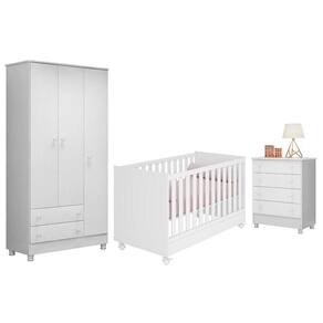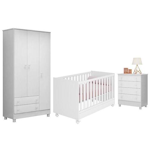 Dormitório Doce Sonho 3 Portas, Cômoda 4 Gavetas E Berço Mini Cama Branco Com Rodízio - Qmovi Branco Dormitório Infantil Doce Sonho 3 Portas, Cômoda 4 Gavetas e Berço Mini Cama com Rodízio - Qmovi Com o Dormitório Infantil Doce Sonho você terá maior funcionalidade e elegância no quarto do bebê. Ele conta com Guarda-Roupa e a Cômoda Doce Sonho com amplo espaço para guardar e organizar os pertences de forma funcional para o dia a dia. Seus puxadores exclusivos em forma de estrela vão transformar o ambiente deixando-o mais divertido e charmoso. Já o Berço Mini Cama foi projetado especialmente para oferecer conforto e ao bebê. Com um design clássico e delicado, ele garante beleza e aconchego para o ambiente. Guarda Roupa Infantil 3 Portas e 2 Gavetas Doce Sonho com Pés - Qmovi - Estrutura em MDP - Pintura UV atóxica - 3 Portas - 2 Gavetas - Corrediças metálicas - Puxadores em forma de estrela - Prateleiras - Cabideiro - Pés em PVC - Maior organização e praticidade