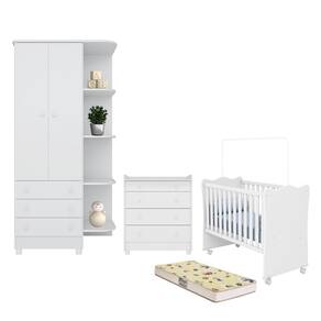 Dormitório Doce Sonho Guarda Roupa, Cômoda Trocador, Berço com Rodízio e Colchão Supreme - Qmovi - Branco