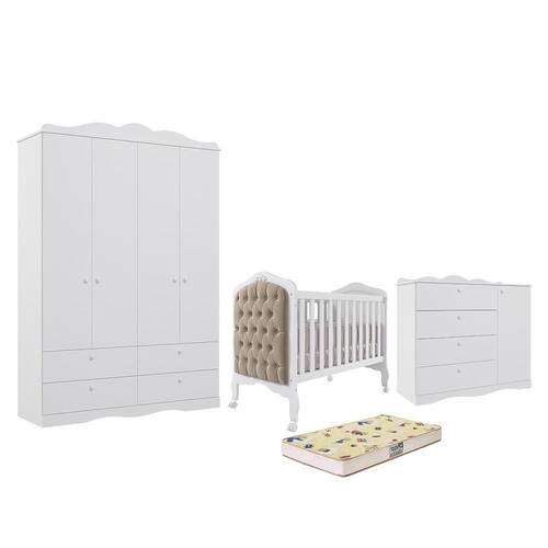 Dormitório Encanto Guarda Roupa, Cômoda e Berço Harmonia com Capitonê e Colchão Supreme - Permóbili Baby