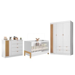 O Dormitório Infantil Ayla inclui Guarda-Roupa, Cômoda e Berço, combinando delicadeza e sofisticação em um design único, com detalhes em ripado para um ambiente sereno. Feitos em MDF resistente e acabamento em pintura UV, o Guarda-Roupa e a Cômoda garantem durabilidade. Múltiplas portas e gavetas com corrediças telescópicas oferecem organização prática, enquanto os puxadores rosê gold adicionam requinte. Com amplo espaço interno e prateleira interna, proporcionam funcionalidade e estilo. O Berço, com pés em madeira, pode ser convertido em mini cama e é certificado pelo Inmetro para segurança do bebê. Ideal para quem busca funcionalidade e estilo encantador para o ambiente do bebê.