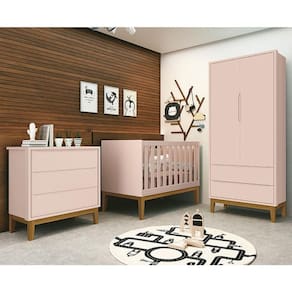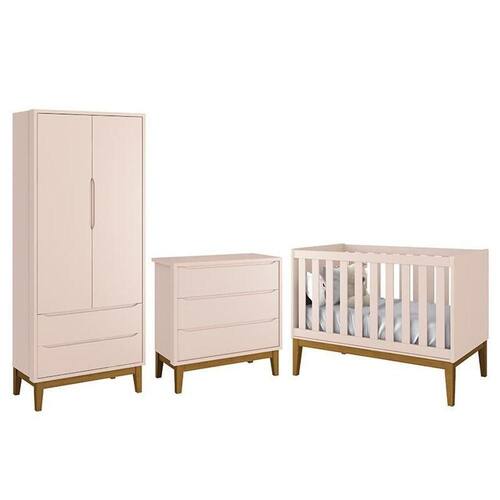 Dormitório Infantil Classic 2 Portas, Cômoda 3 Gavetas E Berço Rosa Fosco Com Pés Amadeirado - Reller Móveis Rosa Fosco