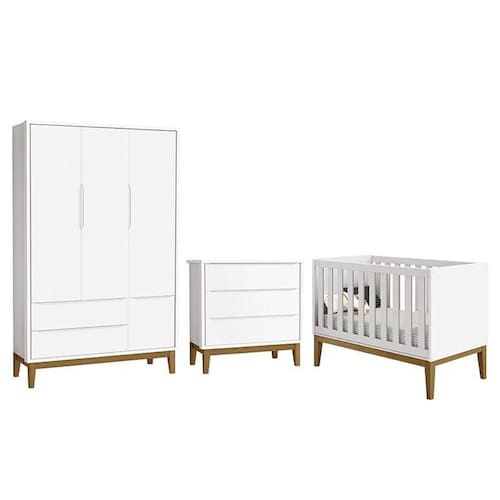Dormitório Infantil Classic 3 Portas, Cômoda 3 Gavetas e Berço com Pés Amadeirado - Reller Móveis O Dormitório Infantil Classic é baseado no estilo clean, traz consigo conceitos de elegância e charme. Conta com um belíssimo Guarda-Roupa Classic com excelentes repartições internas para roupinhas ficarem sempre organizadas. Uma Cômoda Classic 3 gavetas que é um ótimo complemento na hora da organização, ela oferece espaço para roupas dobráveis e pequenos acessórios. E para completar um Berço Mini Cama Classic, que acompanha o desenvolvimento do seu filho e auxilia na transição do berço para caminha. A escolha certa para um ambiente aconchegante e charmoso.