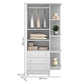 Dimensões: Tamanho do Guarda-Roupa (L x A x P): 88,5 x 191 x 47,5 cm Tamanho da Cômoda (L x A x P): 93 x 85,5 x 45 cm Tamanho do Berço (L x A x P): 68 x 96,8 x 133,5 cm