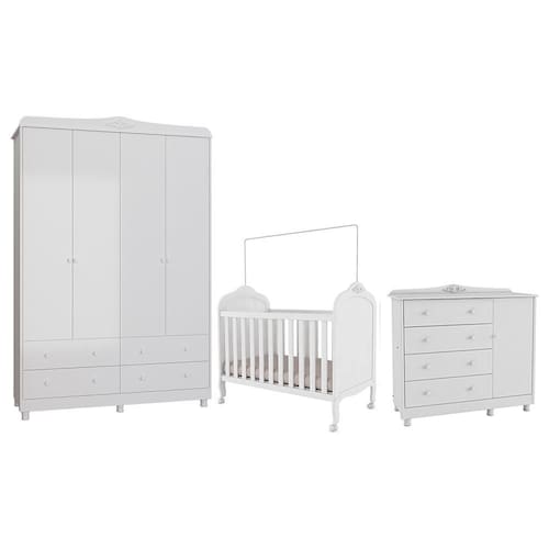 O Dormitório Infantil Elô oferece praticidade, segurança e ótimo aproveitamento de espaço para o quarto do bebê. O guarda-roupa possui 4 portas, 4 gavetas com corrediças telescópicas, cabideiro e prateleiras. A cômoda conta com 1 porta, cabideiro, prateleira interna e 4 gavetas. Ambos são feitos em MDF com pintura UV atóxica, puxadores e pés em plástico. O berço 3 em 1 pode ser utilizado como berço, mini cama ou mini sofá. Possui 3 regulagens de altura do estrado, rodízios com trava, suporte para mosquiteiro e é certificado pelo INMETRO. Recomendado para colchão 130 x 70 cm (não incluso). Um conjunto completo e funcional para acompanhar todas as fases do bebê.