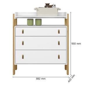 Cômoda Infantil Fantasia 3 Gavetas com Nicho - Qmovi Estrutura em MDP Pintura UV 3 Gavetas Corrediças telescópicas Puxadores inspirados no couro em TPU Nicho e prateleira Sistema antitombamento Pés em MDF de 25mm Suporta até 35Kg distribuídos
