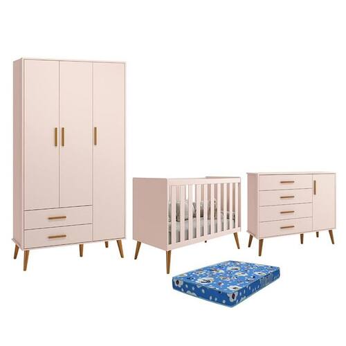 Dimensões: Tamanho do Guarda-Roupa (L x A x P): 112 x 205 x 41 cm Tamanho da Cômoda (L x A x P): 113 x 97 x 41 cm Tamanho do Berço (L x A x P): 133 x 94 x 77 cm Tamanho do Colchão (L x A x P): 70 x 10 x 130 cm