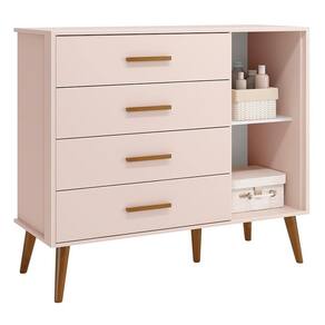 Cômoda Infantil Isis 1 Porta e 4 Gavetas - Reller Móveis • Estrutura 100% MDF • Pintura UV atóxica • Acabamento fosco • 1 Porta • Dobradiças metálicas • 4 Gavetas • Corrediças telescópicas • Sistema anti-tombamento • Puxadores em madeira • Pés estilo retrô em madeira • Amplo espaço interno