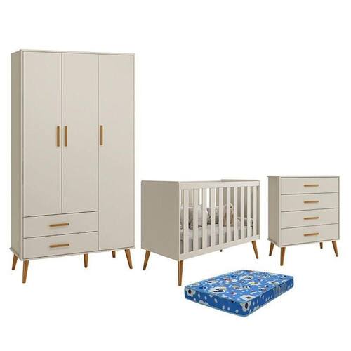 Dormitório Infantil Isis Guarda Roupa 3 Portas, Cômoda E Berço Areia Com Colchão - Reller Móveis Areia