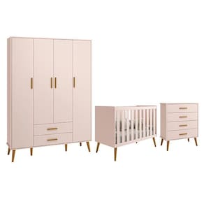 Dormitório Infantil Isis Guarda Roupa 4 Portas, Cômoda E Berço Rosa - Reller Móveis Rosa Dormitório Infantil Isis Guarda Roupa 4 Portas, Cômoda e Berço - Reller Móveis O Dormitório Infantil Isis é composto por um Guarda-Roupa, uma Cômoda e um Berço. O Guarda Roupa Isis 4 Portas e 2 Gavetas e a Cômoda Infantil Isis 4 Gavetas ambos oferecem um amplo espaço para organizar os pertences do seu bebê, seus puxadores são em madeira e suas gavetas possuem um amplo espaço interno para guardar as roupinhas do bebê dobradas. E o Berço Americano Isis se enquadra em todos os termos de qualidade, segurança e durabilidade do produto, pois possui certificação pelo INMETRO. A elegância do estilo retrô aliada ao conforto. Guarda Roupa Infantil Isis 4 Portas e 2 Gavetas - Reller Móveis - Estrutura 100% MDF - Pintura UV atóxica - Acabamento fosco - 4 Portas - Dobradiças metálicas - 2 Gavetas - Corrediças telescópicas - Cabideiro metálico - Prateleira interna - Puxadores em madeira - Pés estilo retrô em madeira - Amplo espaço interno