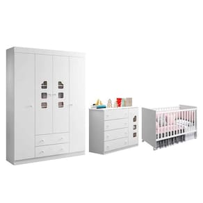 Dormitório Infantil Lívia Guarda Roupa, Cômoda E Berço Tico Branco - Phoenix Baby Branco Dormitório Infantil Lívia Guarda Roupa, Cômoda e Berço Tico - Phoenix Baby O Dormitório Lívia possui traços delicados. É composto por um guarda-roupa e uma cômoda que são peças muito importante para o quarto e para montar o visual perfeito, esse modelo é uma ótima opção. Ele possui compartimentos internos para roupas e objetos em geral ficarem organizados de maneira prática para o dia a dia. E para completar o berço americano Tico para trazer mais segurança e conforto. Todo cuidado que seu bebê precisa nessa combinação perfeita. Guarda Roupa Infantil Lívia 4 Portas e 2 Gavetas - Phoenix Baby - Estrutura em MDF - Pintura UV alto brilho - 4 Portas - Dobradiças metálicas - 2 Gavetas - Corrediças telescópicas - Cabideiro - Nichos - Prateleiras - Maleiro - Puxadores com formato bola - Detalhes em acrílico nas portas - Amplo espaço interno