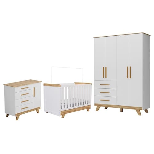 O Dormitório Infantil Retrô oferece um conjunto completo com design clássico, funcionalidade e segurança para o quarto do bebê. O guarda-roupa possui 4 portas, 3 gavetas com corrediças telescópicas, cabideiros metálicos e prateleiras, garantindo excelente espaço interno. A cômoda conta com 1 porta, cabideiro, prateleira e 4 gavetas, ideal para manter tudo bem organizado. Ambos são fabricados em MDF com pintura UV atóxica, puxadores e pés em MDF revestido. O berço 2 em 1 pode ser utilizado como berço ou mini cama, com 3 regulagens de altura do estrado, grades fixas, bordas laqueadas, suporte para mosquiteiro e certificação INMETRO. Recomendado para colchão 130 x 70 cm (não incluso). Um dormitório funcional, seguro e cheio de charme para acompanhar todas as fases do bebê.