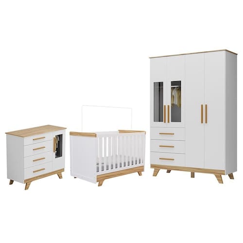 O Dormitório Infantil Retrô oferece um conjunto completo com design clássico, funcionalidade e segurança para o quarto do bebê. O guarda-roupa possui 4 portas, 3 gavetas com corrediças telescópicas, cabideiros metálicos e prateleiras, garantindo excelente espaço interno. A cômoda conta com 1 porta, cabideiro, prateleira e 4 gavetas, ideal para manter tudo bem organizado. Ambos são fabricados em MDF com pintura UV atóxica, puxadores e pés em MDF revestido. O berço 2 em 1 pode ser utilizado como berço ou mini cama, com 3 regulagens de altura do estrado, grades fixas, bordas laqueadas, suporte para mosquiteiro e certificação INMETRO. Recomendado para colchão 130 x 70 cm (não incluso). Conjunto prático, seguro e com toque retrô para o quarto do bebê.